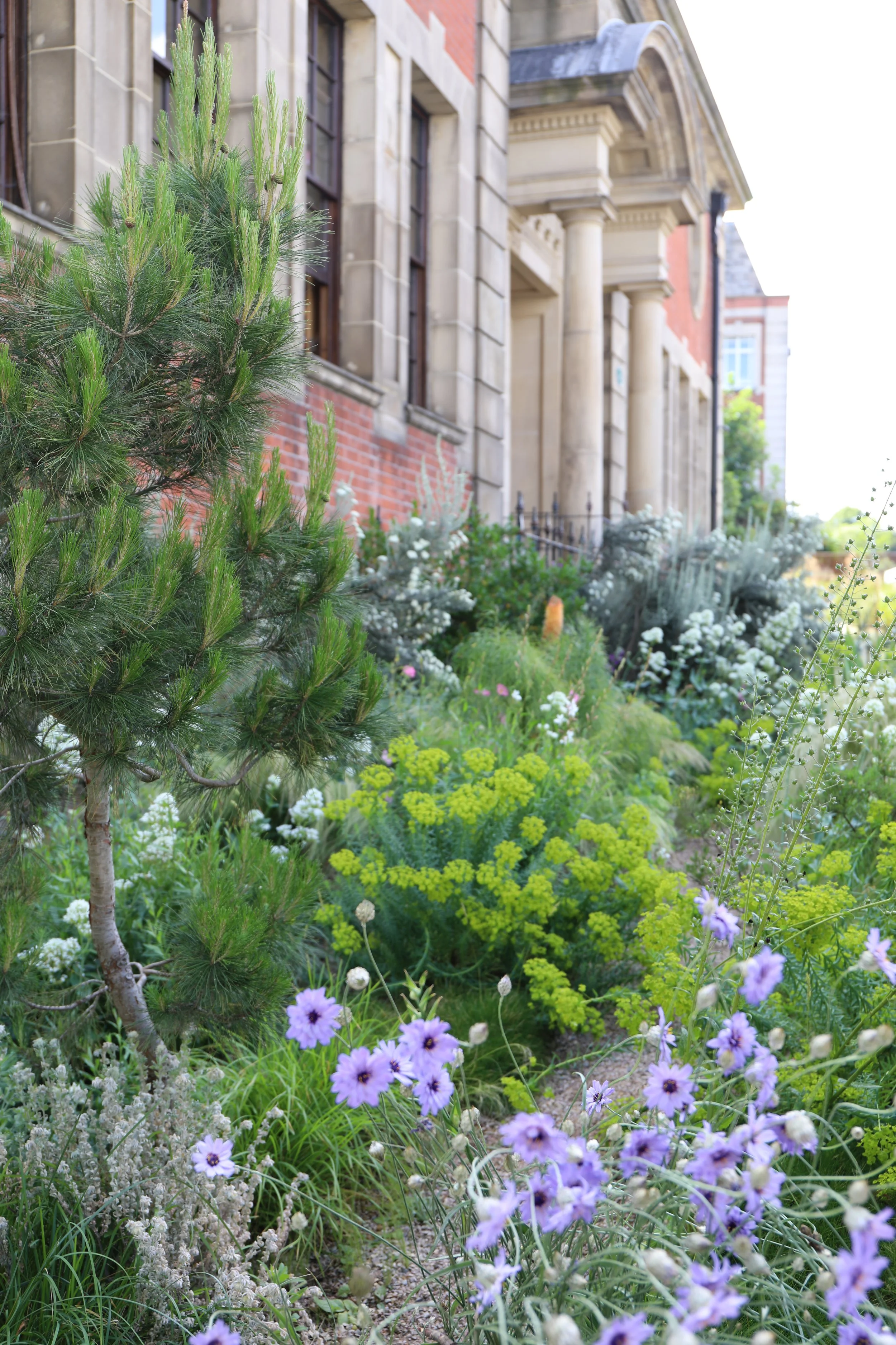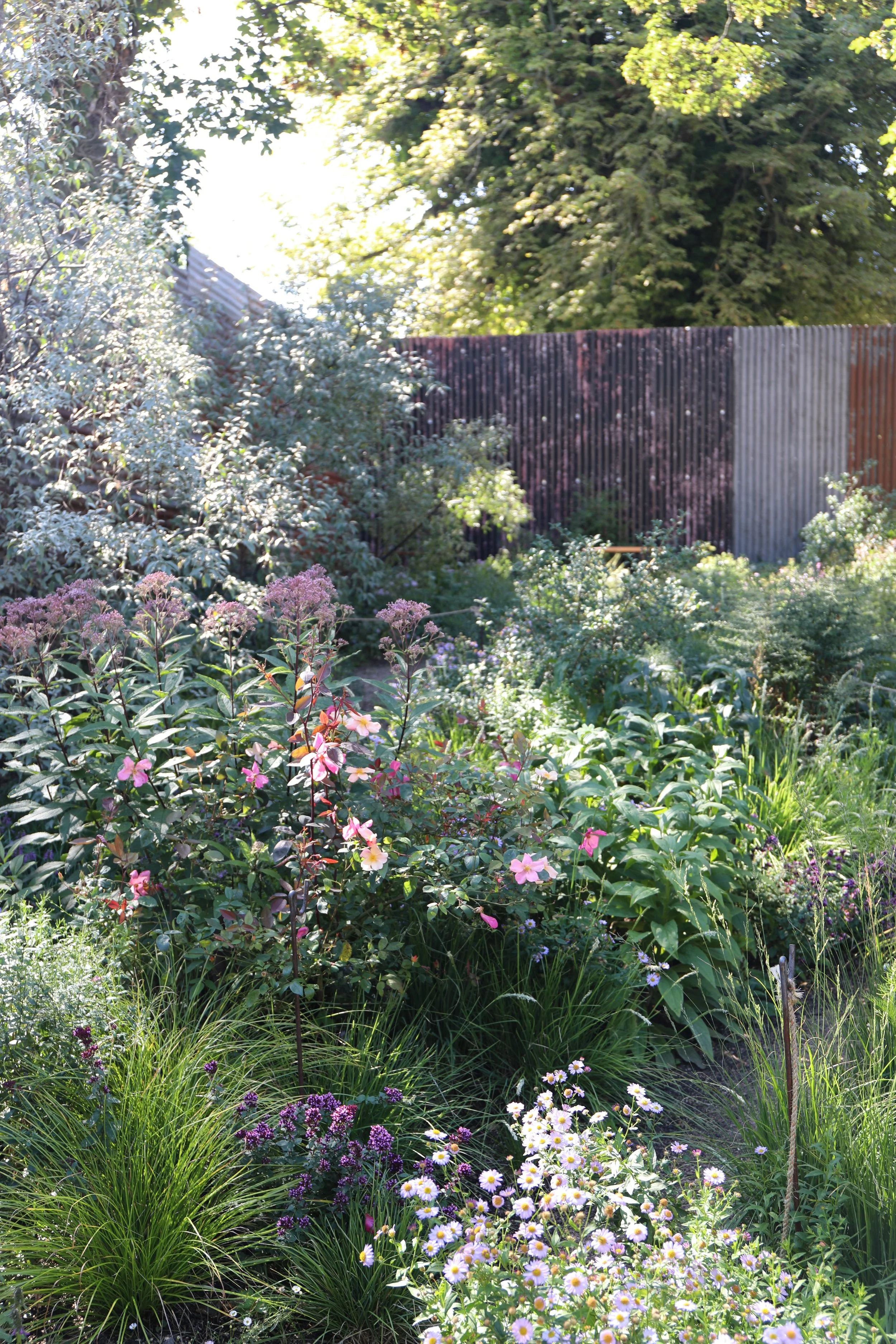 The planting palette is a romantic mix of perennials including Trifolium rubens, asters, grasses, bulbs and roses, with vertical accents from Digitalis lutea. These loose, dreamy combinations are anchored by the silver leafed Eleagnus ‘Quicksilver’ and evergreen Osmanthus x burkwoodii, both of which have small, highly scented flowers in season.