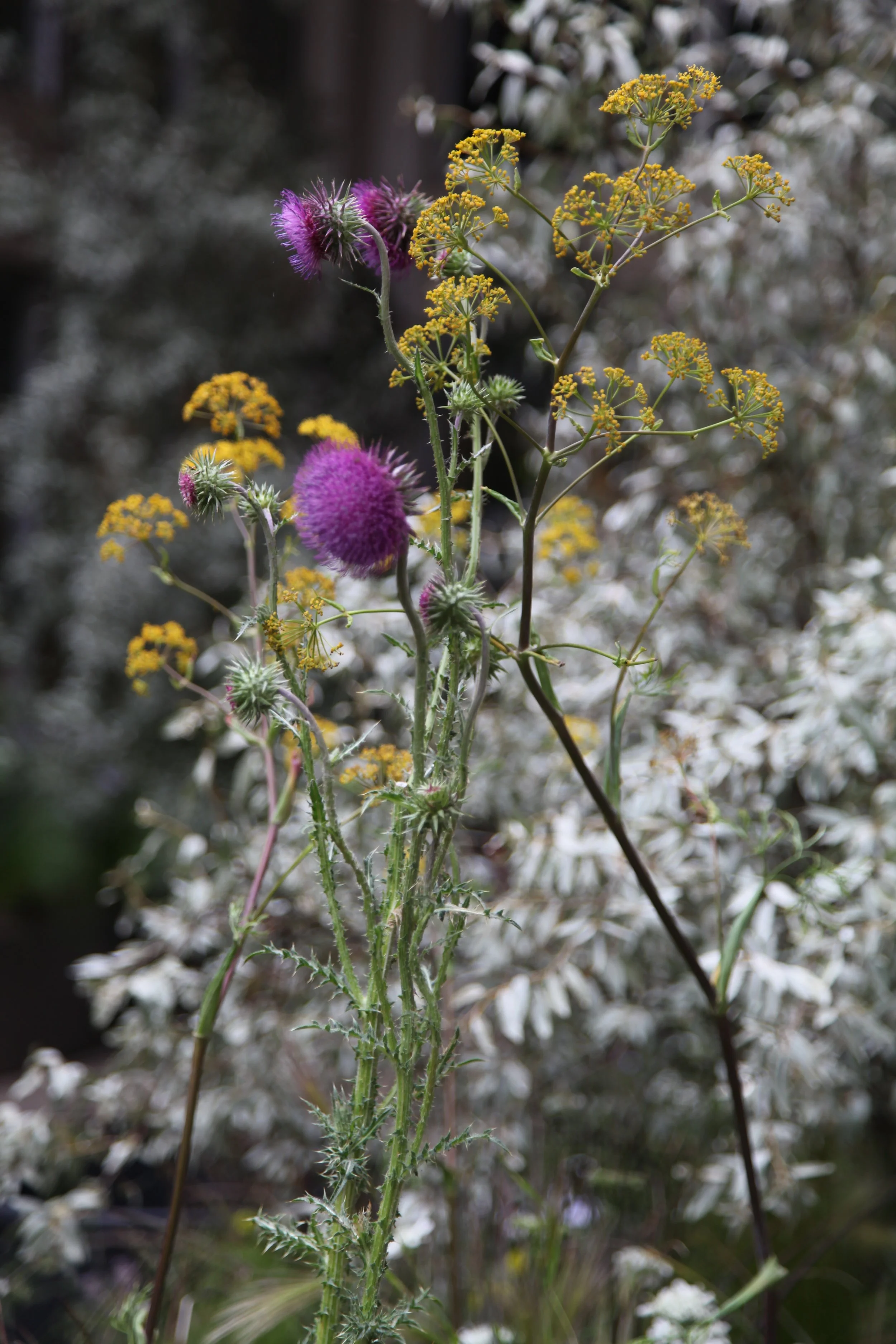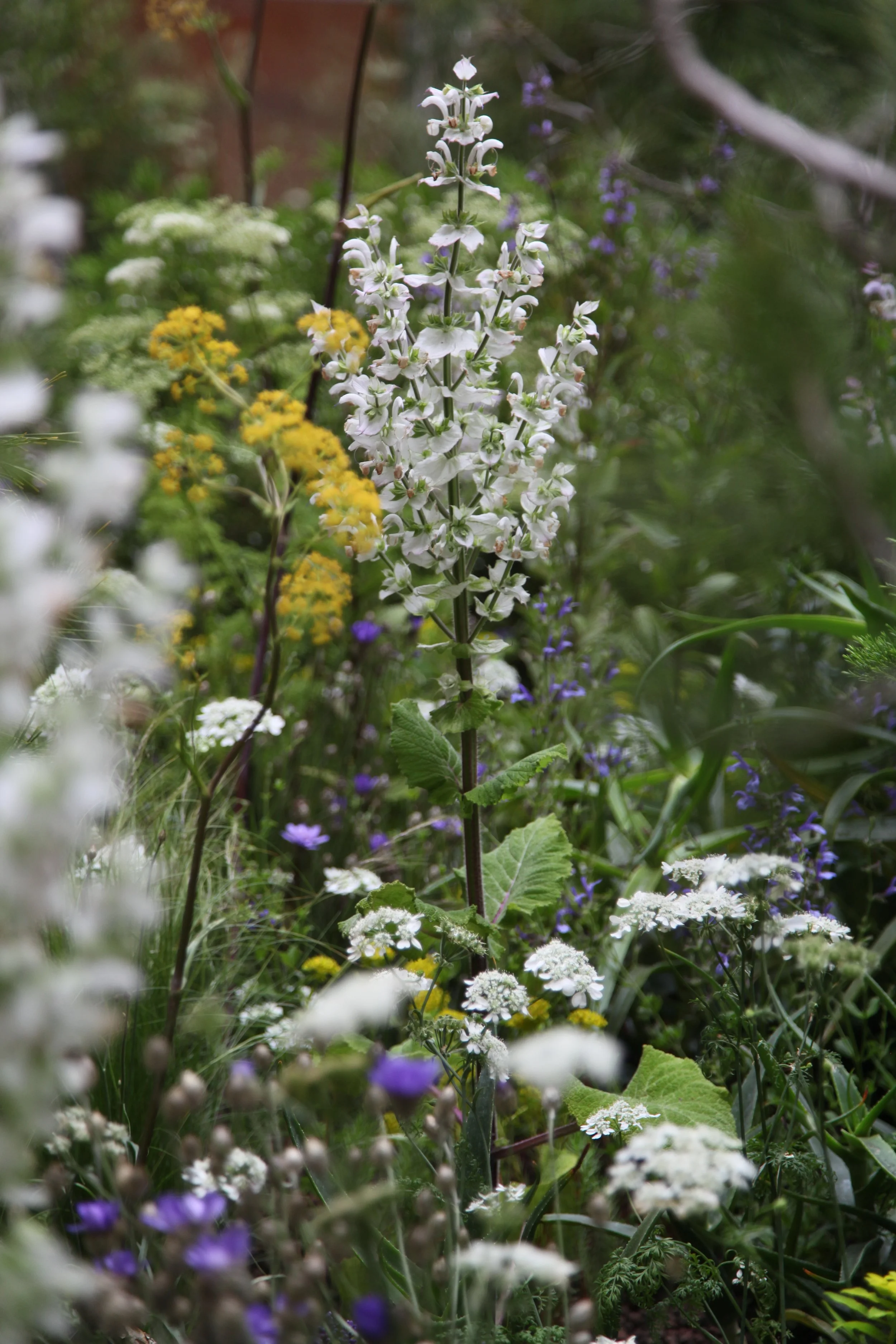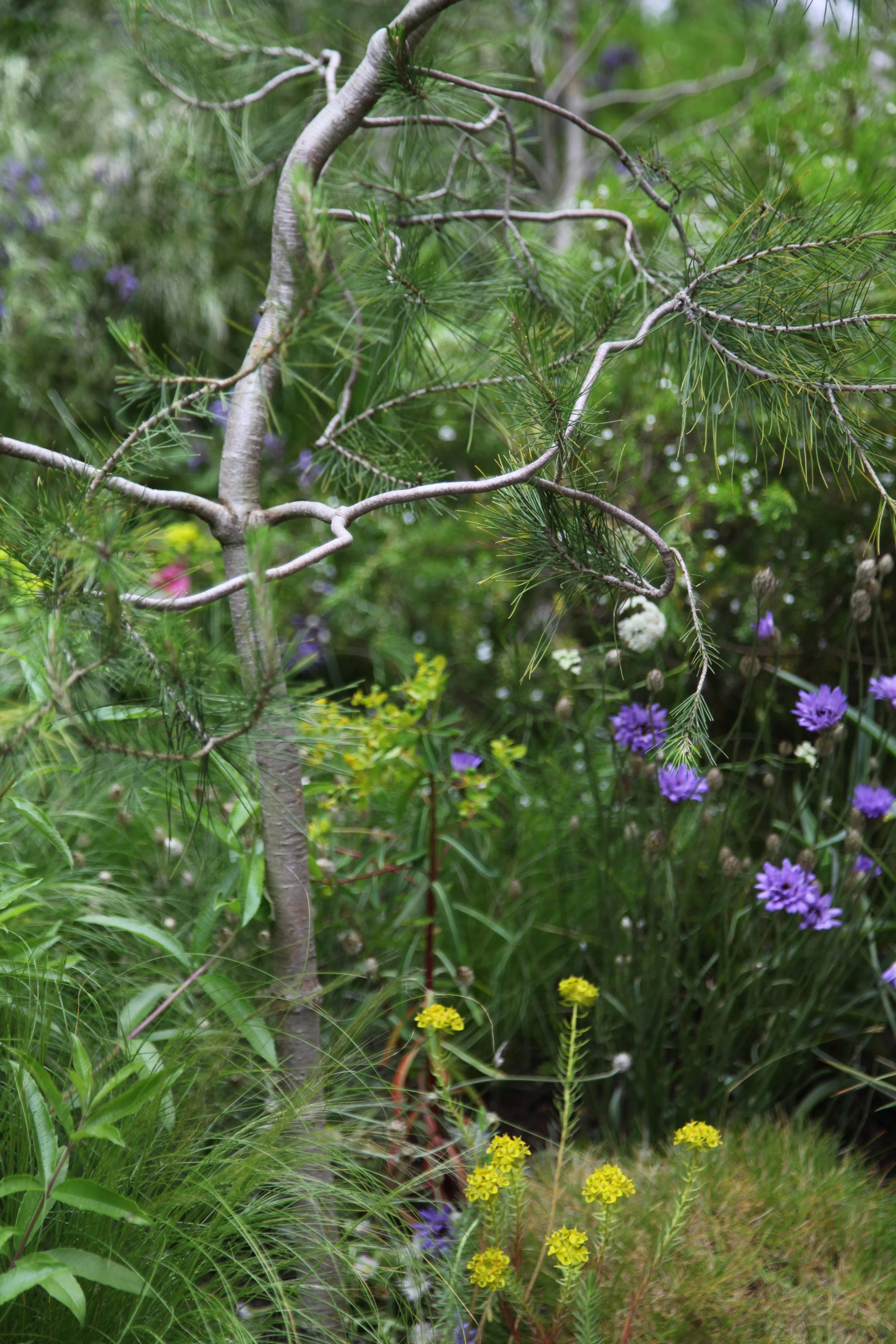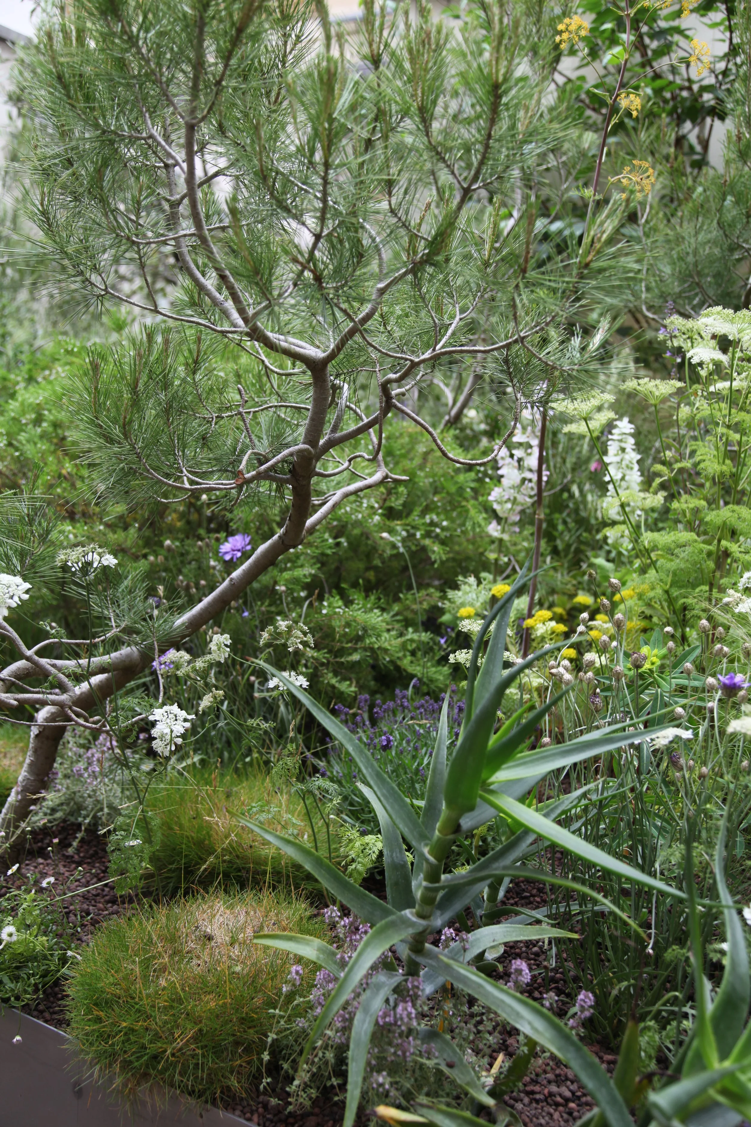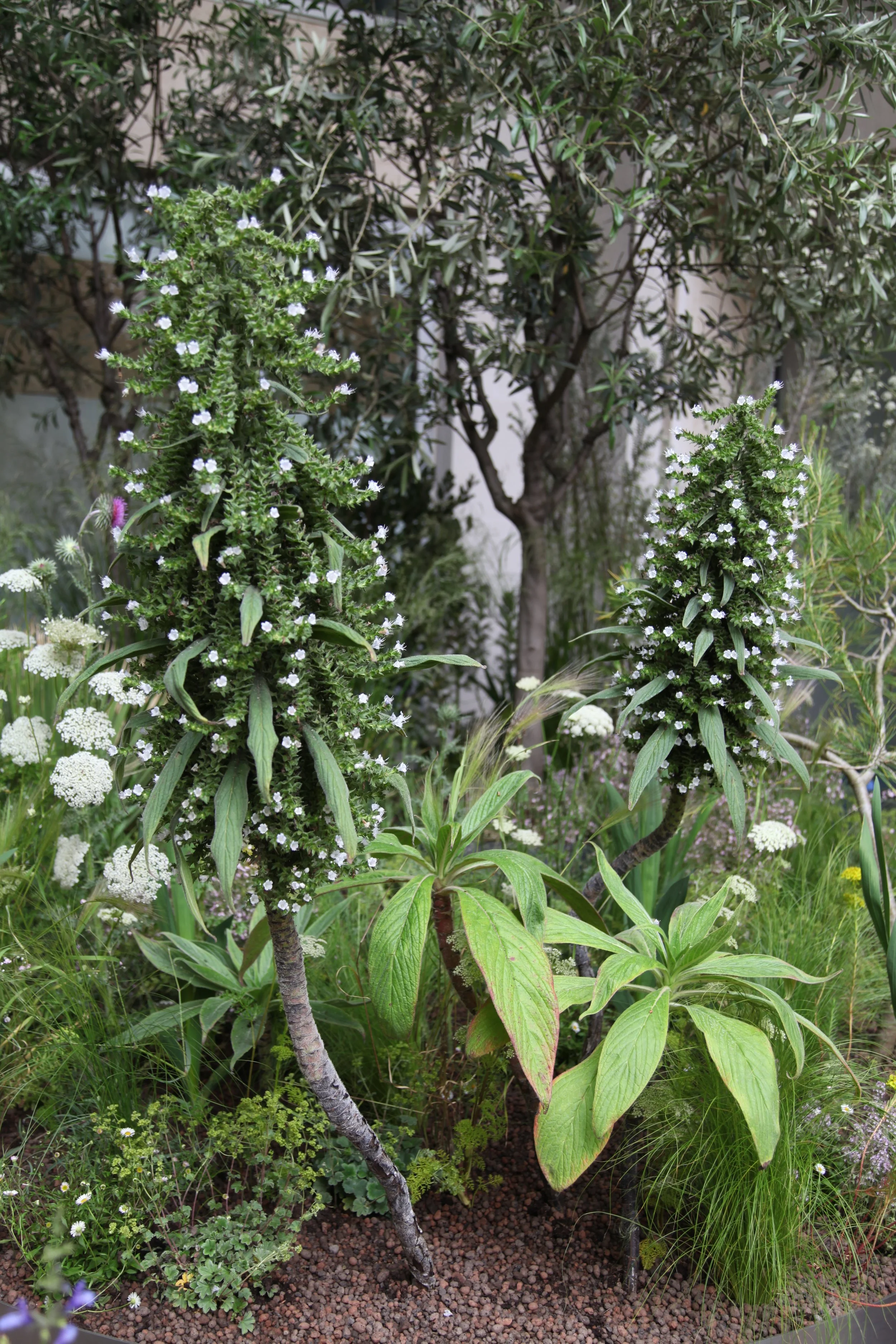Bright, tonal greys of Elaeagnus ‘Quick Silver’ and Ozothamnus rosmarinus ‘Silver Jubilee’ formed a foil for exquisite, jewel-like flowers. Particularly special were the slender, tubular tangerine-red blooms of Hesperaloe parviflora, an evergreen perennial with thin, silver arching leaves. Romneya coulteri, also known as the Californian tree poppy caused a sensation with its fat buds opening daily to reveal white, crumpled, paper-like blooms.